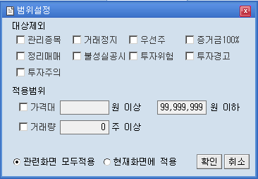 버튼을 클릭하면 ‘범위설정’ 화면이 팝업 되며, 대상제외 항목과 가격대와 거래량의 적용범위를 설정할 수 있습니다.