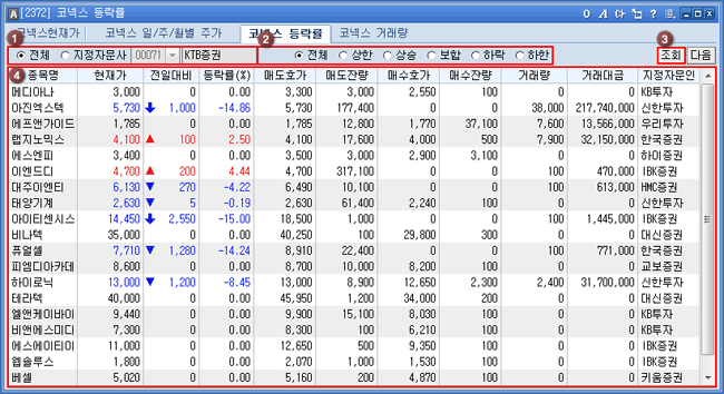 조회하려는 코넥스 종목의 ‘전체, 상한, 상승, 보합, 하락, 하한’ 항목을 선택합니다.