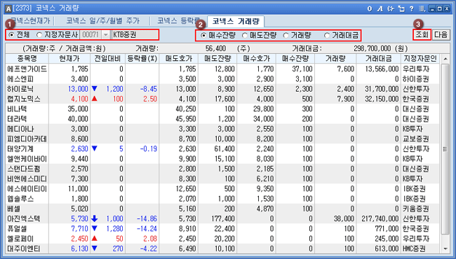 조회하려는 코넥스 종목의 ‘매수잔량, 매도잔량, 거래량, 거래대금’ 항목을 선택합니다.
