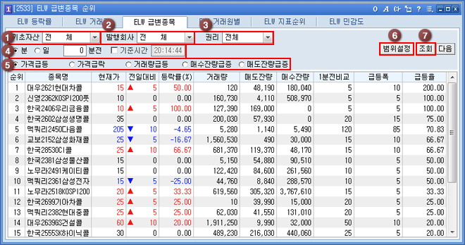 ¹öưÀ» Ŭ¸¯ÇÏ½Ã¸é ¼³Á¤ÇϽŠ¿É¼Ç´ë·Î ELW°¡°Ý±Þµî/±Þ¶ô ¹× °Å·¡·® ±Þµî, ¸Å¼ö/¸ÅµµÀÜ·® ±ÞÁõ µîÀÇ ³»¿ªÀÌ »óÀ§ ¼ø¼´ë·Î Á¶È¸ µË´Ï´Ù.