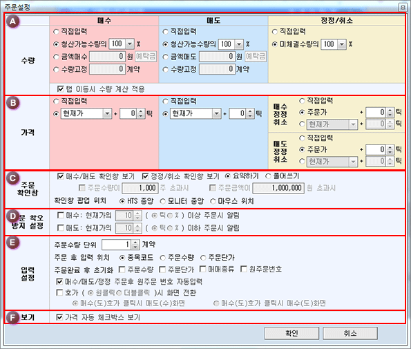 ¸Å¼ö/¸Åµµ È®ÀÎâ º¸±â, Á¤Á¤/Ãë¼Ò È®ÀÎâ º¸±â : ¸Å¼ö/¸Åµµ ÁÖ¹®, Á¤Á¤/Ãë¼Ò ÁÖ¹® ½Ã ÁÖ¹® È®ÀÎâÀÇ ÆË¾÷ ¿©ºÎ¸¦ ¼³Á¤ÇÕ´Ï´Ù.¸Å¼ö/¸Åµµ ÁÖ¹®À» ¼±ÅÃÇϽаæ¿ì ÁÖ¹®¼ö·®ÀÌ()ÁÖÃʰú/ÁÖ¹®±Ý¾×ÀÌ()¿øÃʰú½Ã¸¦ ¼³Á¤ÇÏ½Ç ¼ö ÀÖ½À´Ï´Ù.