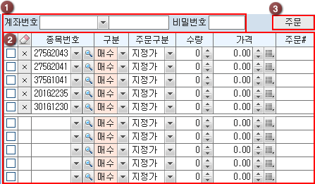 일괄주문을 실행할 계좌번호를 선택한 후 비밀번호를 입력합니다.