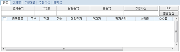 잔고 : 현재 계좌의 평가손익, 수익률, 실현손익 등의 현황과 보유종목에 대한 일괄매도주문을 실행할 수 있습니다. 또한 버튼을 클릭하면 계좌의 자산현황을 조회할 수 있으며 "일괄청산" 버튼을 클릭하여 청산주문을 실행합니다.
