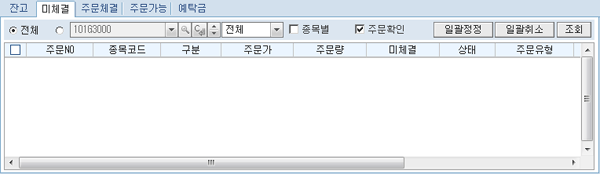 미체결 : 당일 전체 또는 종목별 미체결 현황을 조회할 수 있으며, 조회된 미체결 내역에 대하여 장중 일괄정정/ 일괄취소 주문을 실행시킬 수 있습니다.