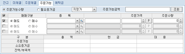 주문가능 : 선택한 종목의 매수가격을 입력하신 후 버튼을 클릭하시면 종목에 대 한 주문가능 수량을 확인할 수 있습니다.