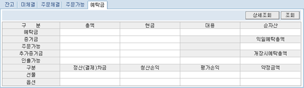 예탁금 : 고객 계좌의 예탁금, 증거금, 주문가능금액, 추가증거금, 순자산, 익일예탁총액 등의 자산현황과 선물과 옵션의 정산차금, 청산손익, 평가손익, 약정금액 등의 계좌현황의 조회가 가능합니다.