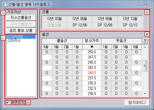 화면유지 항목에 v 체크 하시면, 종목 선택 후에도 종목안내창이 종료되지 않고 유지되어 다른 종목을 선택할 수 있습니다.