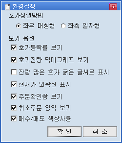 좌우 대칭형/좌측 일자형 : 호가창의 배열형식을 설정할 수 있습니다.