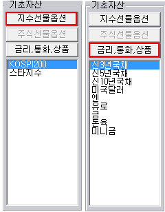 기초자산 선택 영역입니다. '지수선물옵션, 주식선물옵션, 금리,통화,상품' 중에서 선택하시면 영역에 해당 기초자산 항목이 생성됩니다.