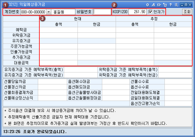 Ç׸ñ¿¡¼ 'ÇöÀç°¡'¿¡ v üũÇÑ °æ¿ì Á¶È¸ ½Ã ¸¶´Ù KOSPI200Áö¼öÀÇ ÇöÀç°¡°¡ ½Ç½Ã°£ ¹Ý¿µµÇ¾î Á¶È¸µÇ¸ç, Vüũ¸¦ ÇÏÁö ¾Ê°í KOSPI200Áö¼ö¸¦ Á÷Á¢ ÀÔ·ÂÇϸé ÀÔ·ÂÇÑ Áö¼ö¸¦ ±âÃÊ·Î ÇÑ Áõ°Å±Ý ÇöȲÀ» Á¶È¸ÇÒ ¼ö ÀÖ½À´Ï´Ù.