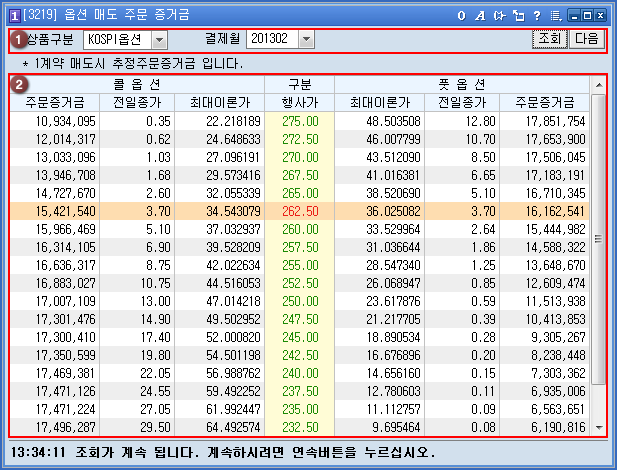 선택한 상품구분과 결제월의 옵션월물에 대한 '주문증거금, 전일종가, 최대이론가' 등의 정보를 콜옵션/풋옵션별로 조회할 수 있습니다.