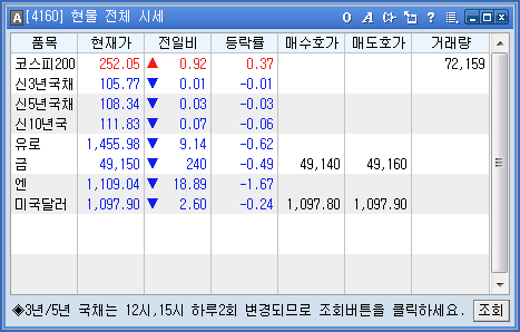 'ÄÚ½ºÇÇ200,½ºÅ¸Áö¼ö,3³â±¹Ã¤,5³â±¹Ã¤,10³â±¹Ã¤,À¯·Î,±Ý,¿£,µ·À°, ¹Ì±¹´Þ·¯' µîÀÇ Çö¹° 'ÇöÀç°¡, ÀüÀÏ´ëºñ, µî¶ôÀ², ¸Åµµ/¸Å¼öÈ£°¡, °Å·¡·®' µîÀÇ Àüü ½Ã¼¼ÇöȲÀ» Á¶È¸ÇÒ ¼ö Àִ ȸéÀÔ´Ï´Ù.