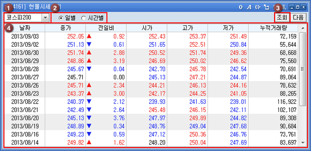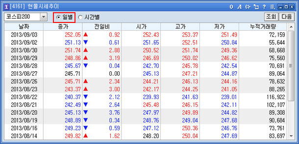 ÀϺ°·Î Á¶È¸ ½Ã ÇØ´çÁ¾¸ñÀÇ "Á¾°¡/ÀüÀϺñ/½Ã°¡/°í°¡/Àú°¡/´©Àû°Å·¡·®"À» Á¶È¸ ÇÒ ¼ö ÀÖ½À´Ï´Ù.