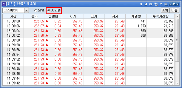 ½Ã°£º°·Î Á¶È¸ ½Ã ÇØ´çÁ¾¸ñÀÇ "Á¾°¡/ÀüÀϺñ/¸Å¼öÈ£°¡/¸ÅµµÈ£°¡/½Ã°¡/°í°¡/Àú°¡/ü°á·®/´©Àû°Å·¡·®"À» Á¶È¸ ÇÒ ¼ö ÀÖ½À´Ï´Ù.