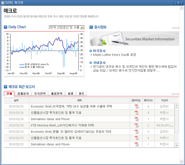 °æÁ¦¿Í ÁֽĽÃÀåÀ» ºÐ¼®ÇÑ °ÍÀ» ¹ÙÅÁÀ¸·Î °æÁ¦, ÁÖ½Ä, ä±Ç, ÆÄ»ý»óǰ ¿¡ ´ëÇÑ 'Daily Chart, ±¹³»/¿Ü Áõ½ÃÁ¤º¸, º¸°í¼' µîÀÇ ´Ù¾çÇÑ Á¤º¸¸¦ Á¦°øÇϴ ȸéÀÔ´Ï´Ù.