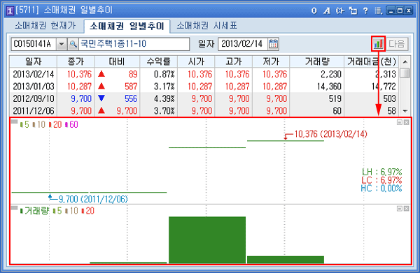 ¹öưÀ» Ŭ¸¯Çϸé ÀÏÀÚ º° °¡°ÝÃßÀ̸¦ Â÷Æ®¿Í µ¥ÀÌÅÍ·Î µ¿½Ã¿¡ Á¶È¸ÇÒ ¼ö ÀÖ½À´Ï´Ù.