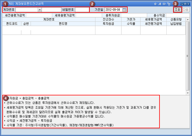 버튼을 클릭하여 선택한 계좌의 보유 펀드 잔고내역을 확인할 수 있습니다.