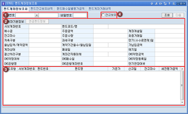 "잔고보유" 체크 박스를 선택하면 서브계좌 혹은 전체 서브계좌 잔고를 확인할 수 있습니다.