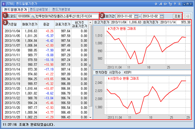 지정한 기간의 일별 펀드 기준가를 확인할 수 있으며, 화면 우측에는 기준가 변동 그래프 및 시장지수 변동 그래프가 조회됩니다.