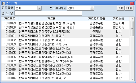 조회를 원하는 펀드를 선택합니다. 펀드코드를 입력하거나 버튼을 클릭하여 펀드유형을 선택할 수 있습니다.