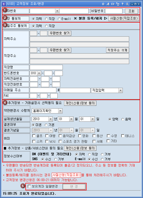 ¹öưÀ» ´©¸£½Ã¸é °í°´Á¤º¸ º¯°æÀÌ ¿Ï·áµË´Ï´Ù. ¶ÇÇÑ 'º¸À¯°èÁ Àϰýº¯°æ' ¿¡ VüũÇÏ½Ã¸é º¸À¯ÇÏ°í °è½Å ¸ðµç °èÁÂÀÇ Á¤º¸¸¦ ÀϰýÀûÀ¸·Î º¯°æµË´Ï´Ù.