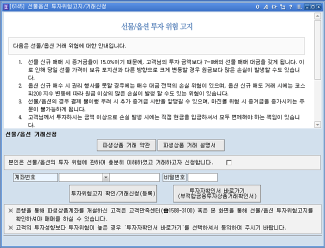 선물/옵션 거래를 하기 위해서 투자위험고지 대한 안내입니다. 본 화면을 통해 선물/옵션 투자위험고지를 확인하셔야 매매를 하실 수 있습니다. 은행을 통해 파생상품계좌를 개설하신 고객은 고객만족센터 전화 1588-3100 혹은 본 화면을 통해 선물/옵션 투자위험고지를 확인하셔야 매매를 하실 수 있습니다.