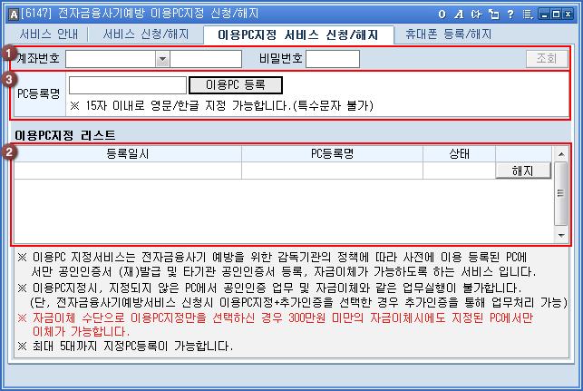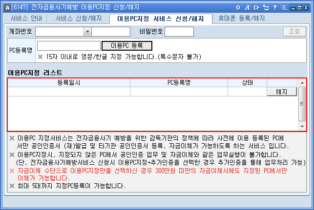 이용PC지정 리스트에 보여지는 항목의 해지버튼을 클릭하여 해지 절차를 진행합니다.