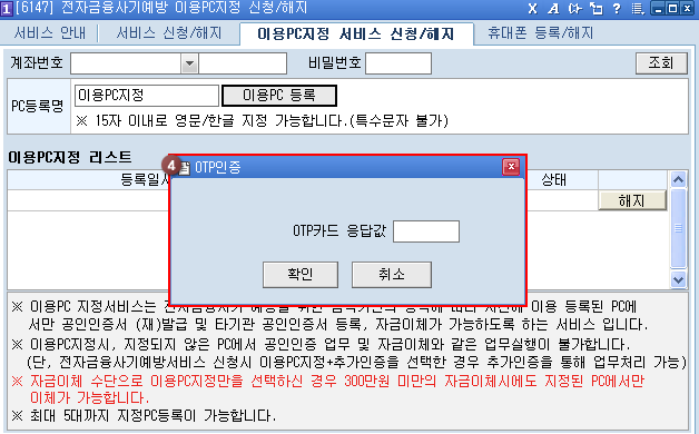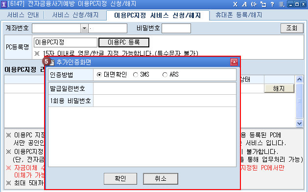 보안매체입력 후 이용PC지정을 위하여 추가인증 3가지 방법 중 한가지를 선택합니다.