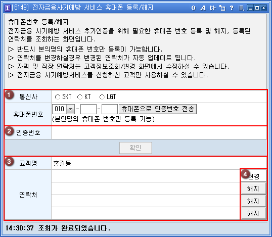 등록된 휴대전화번호는 화면 하단에 등록되어 리스트 형식으로 조회할 수 있습니다.