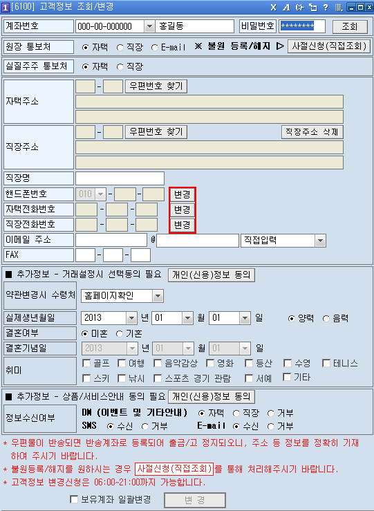 변경버튼 클릭시 '[6100] 고객정보 조회/변경' 화면으로 연동이 됩니다.