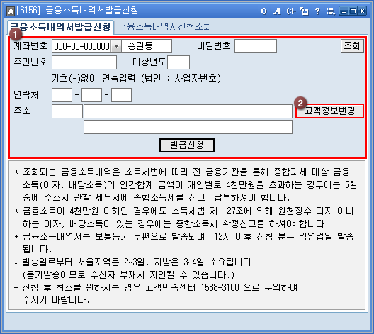 고객정보가 틀리거나 수정을 원하시는 경우, '고객정보변경' 버튼을 클릭하면 "[6100] 고객정보 조회/변경" 화면이 팝업되어 고객님의 원장주소 변경이 가능합니다.
