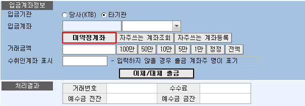 입금계좌정보란 : 입금 받을 기관과 계좌, 거래금액 등을 입력하는 화면으로 기본적으로 타기관 미약정계좌로 설정되어 있습니다.