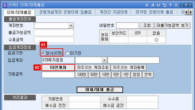 당사(KTB)를 선택 시 당사(KTB)개설계좌 내에서 본인명의/타인명의 계좌로 대체 가능하고, 타기관을 선택 시 타기관의 약정계좌/미약정계좌로 출금 가능합니다.