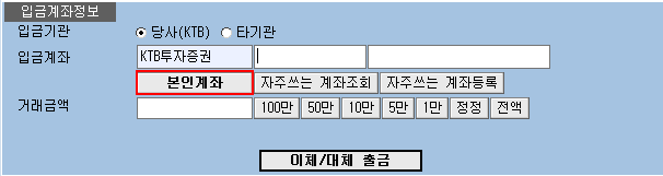 기본적으로 당사(KTB)를 선택하면 당사에 개설된 본인명의 계좌가 자동으로 조회됩니다.