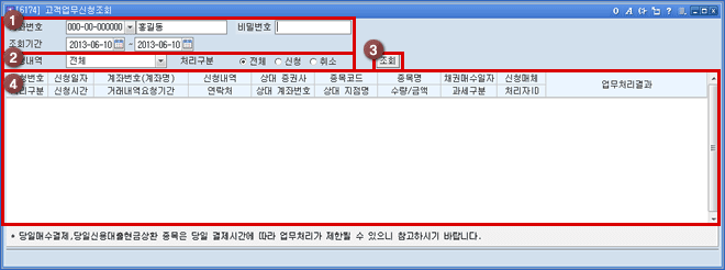 '타사대체출고, 유가증권실물출고예약, 거래내역신청, 금융소득내역서' 중 조회를 원하는 신청내역을 선택한 후 '전체, 신청, 취소' 중 조회를 원하는 처리구분을 지정합니다.