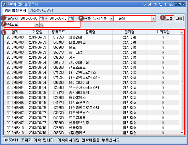 ¼±ÅÃÇÑ ±Ç¸®±¸ºÐ¿¡ ÇØ´çÇÏ´Â Á¾¸ñ ¸®½ºÆ®¿Í 'ÀÏÀÚ, ±âÁØÀÏ, ±Ç¸®¸í, ó¸®ÀÛ¾÷' À» Á¶È¸ÇÒ ¼ö ÀÖ½À´Ï´Ù.