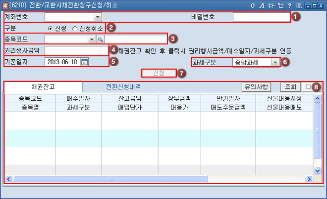 Àüȯ ¶Ç´Â ±³È¯ »ç並 ÁÖ½ÄÀ¸·Î Àüȯû±¸ ½Åû ¶Ç´Â Ãë¼Ò¸¦ ¿øÇÏ´Â Á¾¸ñÀ» ¼±ÅÃÇÕ´Ï´Ù. ¶ÇÇÑ ÇÏ´ÜÀÇ 'ä±ÇÀܰí' ÅÇ¿¡¼ Á¾¸ñÀ» ¼±ÅÃÇϽøé Á¾¸ñ¸íÀÌ ÀÚµ¿ÀԷµ˴ϴÙ.
