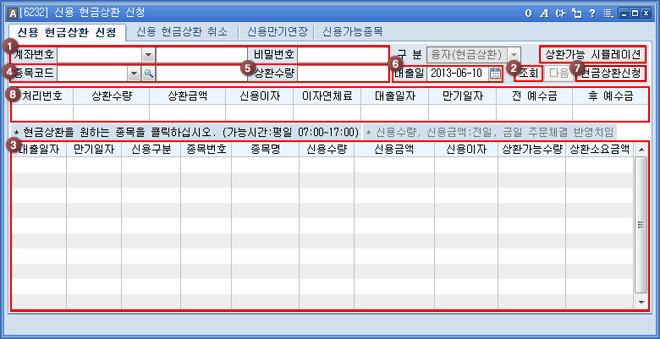 '󸮹øÈ£, »óȯ¼ö·®, »óȯ±Ý¾×, ½Å¿ëÀÌÀÚ, ÀÌÀÚ¿¬Ã¼·á, ´ëÃâÀÏÀÚ, ¸¸±âÀÏÀÚ, Àü/ÈÄ¿¹¼ö±Ý' µîÀÇ Çö±Ý»óȯ ½Åû ³»¿ªÀ» È®ÀÎÇÒ ¼ö ÀÖ½À´Ï´Ù.