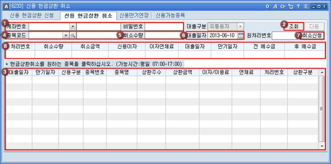 '󸮹øÈ£, Ãë¼Ò¼ö·®, Ãë¼Ò±Ý¾×, ½Å¿ëÀÌÀÚ, ÀÌÀÚ¿¬Ã¼·á, ´ëÃâÀÏÀÚ, ¸¸±âÀÏÀÚ, Àü/ÈÄ¿¹¼ö±Ý' µîÀÇ Çö±Ý»óȯ ½Åû Ãë¼Ò ³»¿ªÀ» È®ÀÎÇÒ ¼ö ÀÖ½À´Ï´Ù.