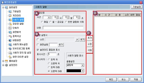 °¢ ¹öưÀ» Ŭ¸¯ÇÏ¸é ¾Ë¶÷ÀÇ ¼³Á¤À» Ãß°¡/¼öÁ¤/»èÁ¦ÇÒ ¼ö ÀÖ½À´Ï´Ù.