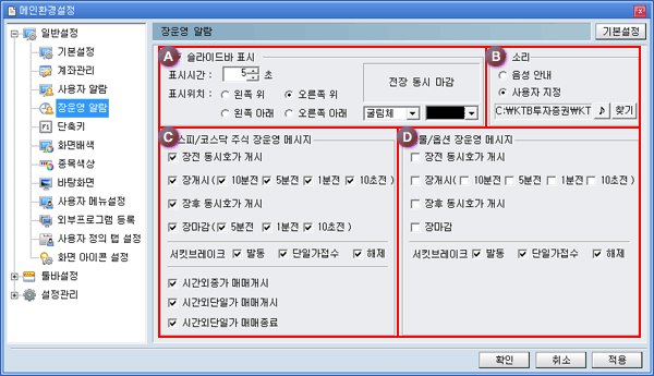 Àå Àü/ÈÄ µ¿½ÃÈ£°¡ °³½Ã, À帶°¨, ¼Å¶ºê·¹ÀÌÅ©, ½Ã°£¿ÜÁ¾°¡, ½Ã°£¿Ü´ÜÀϰ¡ ¸Å¸Å µî°ú °ü·ÃµÈ Àå¿î¿µ°ú °ü·ÃµÈ °¢Á¾ ¾Ë¶÷ÀÇ »ç¿ë ¿©ºÎ¿Í ½½¶óÀÌµå ½Ã°£, Ç¥½Ã ¿É¼ÇÀ» ¼³Á¤ÇÒ ¼ö ÀÖ½À´Ï´Ù.