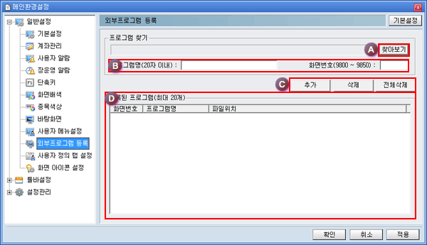 °¢ ¹öưÀ» Ŭ¸¯ÇÏ¿© ÇÁ·Î±×·¥ Ãß°¡/ »èÁ¦ÇÕ´Ï´Ù.