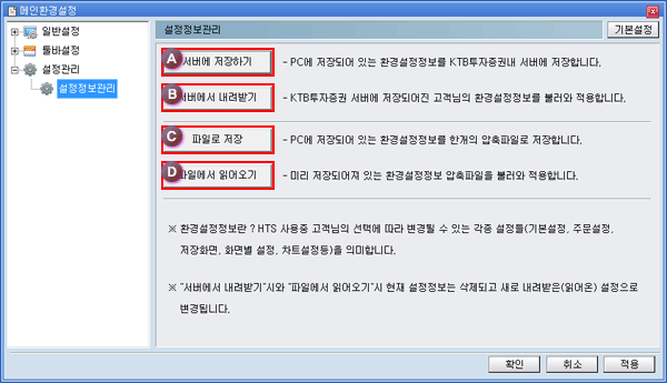 PC¿¡ ÀúÀåµÇ¾î Àִ ȯ°æ¼³Á¤Á¤º¸¸¦ ¼¹ö ȤÀº ÆÄÀÏ·Î ÀúÀå/³»·Á¹Þ±â ÇÒ ¼ö ÀÖ½À´Ï´Ù.