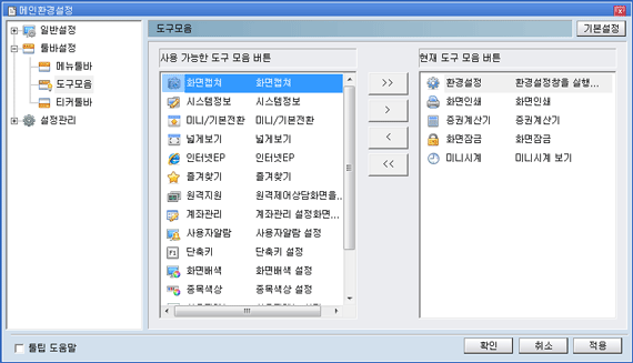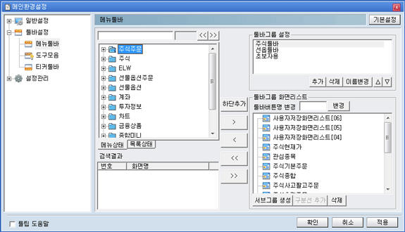 ¸Þ´º Åø¹Ù ¼³Á¤ : ¼±ÅÃÇϸé '¸ÞÀÎȯ°æ¼³Á¤Ã¢' ÀÇ ¸Þ´ºÅø¹Ù ¼³Á¤È¸éÀÌ ÆË¾÷µÇ¾î Åø¹Ù±×