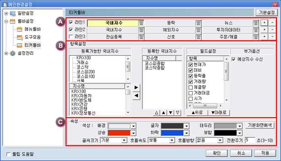 ¹öưÀ» Ŭ¸¯ÇÏ¸é ¡®Æ¼Ä¿¼³Á¤¡¯ âÀÌ ÆË¾÷ µÇ¸ç, »ç¿ëÀÚ°¡ ¼±ÅÃÇÑ ±¹³»Áö¼ö/ ÇØ¿ÜÁö¼ö/ µî¶ô/ °ü½ÉÁ¾¸ñ/ ´º½º/ ÅõÀÚÀÚµ¥ÀÌÅÍ/ ½ÅÈ£/ ÁÖ¹®/ ü°á µîÀÇ ³»¿ëÀ» ½Ç½Ã°£À¸·Î È®ÀÎÇÒ ¼ö ÀÖ´Â Æ¼Ä¿Åø¹ÙÀÇ ¼³Á¤À» º¯°æÇÒ ¼ö ÀÖ½À´Ï´Ù.