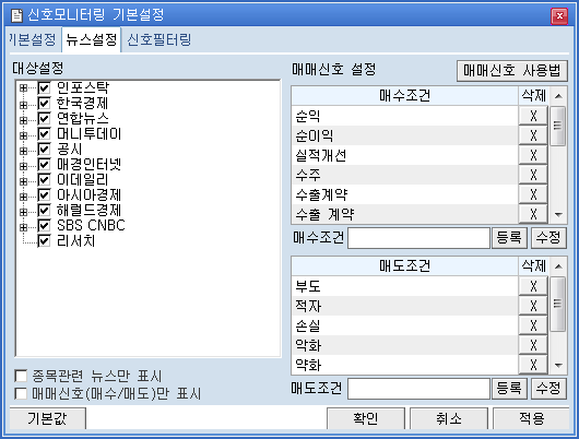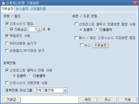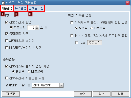 ¹öưÀ» Ŭ¸¯ÇÏ¸é ¡®½ÅÈ£¸ð´ÏÅ͸µ ±âº»¼³Á¤¡¯ âÀÌ ÆË¾÷ µÇ¸ç, ¡®±âº»¼³Á¤/´º½º¼³Á¤/½ÅÈ£ÇÊÅ͸µ¡¯ µîÀ» ¼³Á¤ÇÒ ¼ö ÀÖ½À´Ï´Ù.